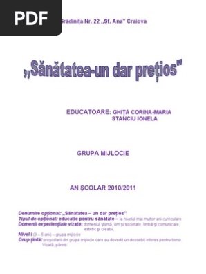 Educatie Pentru Sanatate Optional Planificare Grupa Mijlocie Gina Hurduc 24 02 2007 Source from : https://www.didactic.ro/materiale-didactice/24652_educatie-pentru-sanatate-optional-planificare-grupa-mijlocie „educatie pentru sanatate vine in intampinarea nevoilor fundamentale de educatie ale oricarui copil, iar formarea unui stil de viata sanatos, dobandirea de repere in orientarea scolara si profesionala, devin conditii esentiale pentru dezvoltarea armonioasa a personalitatii elevului. Educatie fizica, curriculum, liceu, ru. Cursurile se desfasoara la sediul gradinitei happy kiddo. Es urmăreşte optimizarea sănătăţii şi prevenirea sau reducerea îmbolnăvirilor la nivel. Dinti sanatosi dreptul la sntate este unul din drepturile fundamentale ale omului.conform organizatiei mondiale a sntatii, sntatea individului este definit drept o stare de bine fizica,mentala si social si nu doar absenta bolii sau infirmitatii.