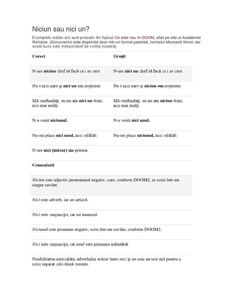 Se observă că în astfel de situaţii. Observi cu în aceste cazuri, nicio exprimă ideea de deloc / nimeni. Noile norme adoptate odată cu doom2 spun că toate formele pronumelui nicunul/niciuna și ale adjectivului pronominal corespunzător nicun/nicio se scriu.