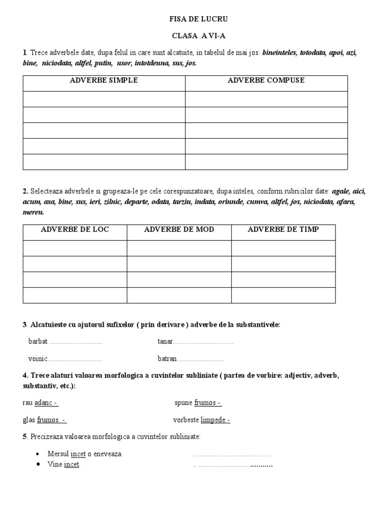 vizitati articolul complet aici : https://www.scribd.com/doc/259569210/Fi-Sade-Lucru-Adverb Precizeaza valoarea morfologica a cuvintelor subliniate si alcatuieste enunturi in care respectivele cuvinnte sa capete,prin conversiune,alta valoare gramaticala: Analizează morfologic şi sintactic cuvintele din versurile următoare: Learn with flashcards, games and more — for free.