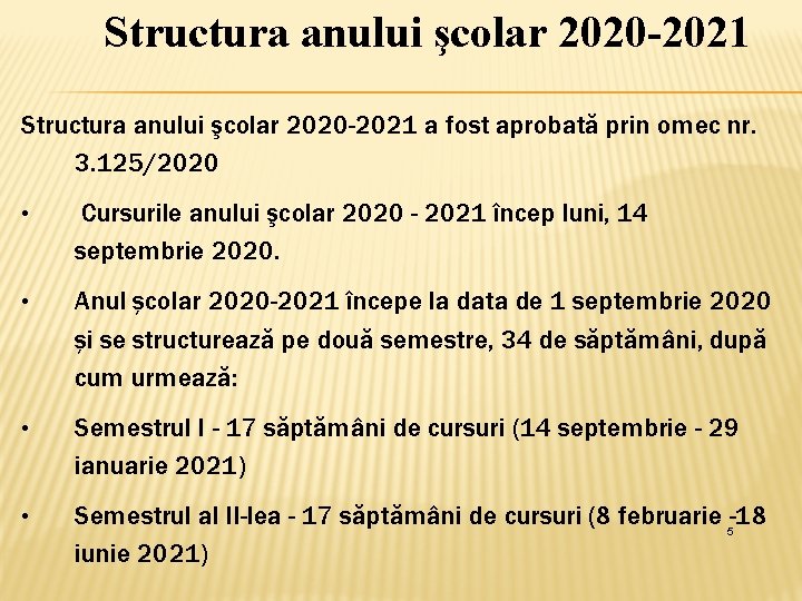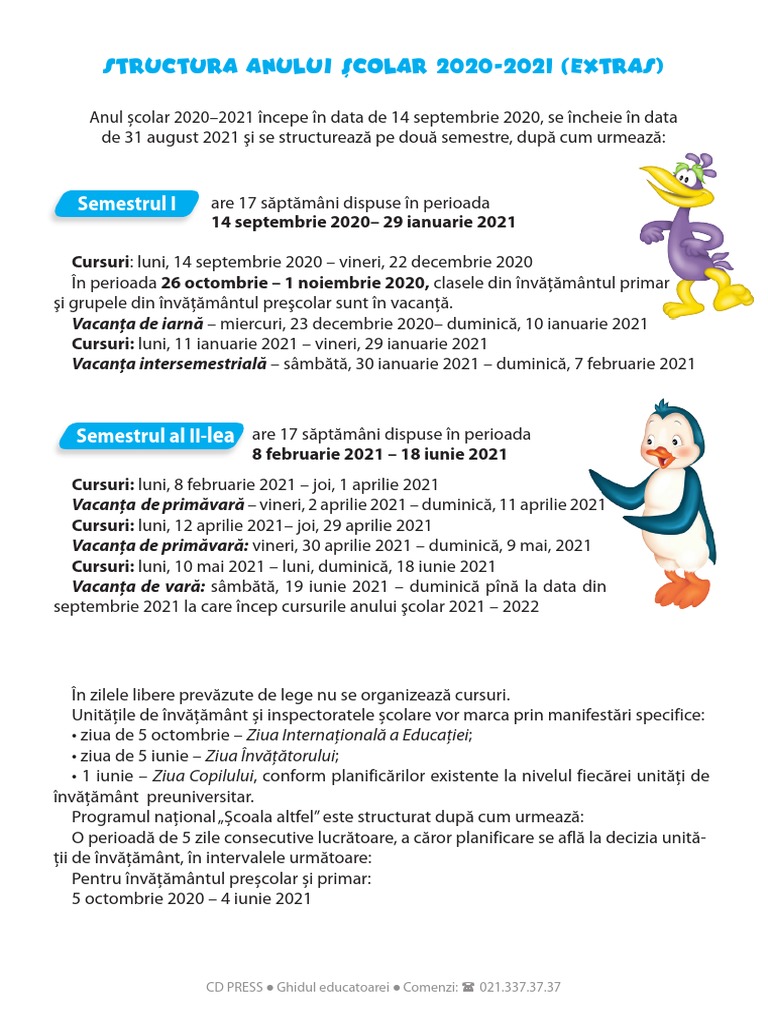 Structura anului școlar cuprinde semestrul i 14 septembrie 2020 29 ianuarie 2021 şi semestrul al ii lea 8 februarie 2021 18 iunie 2021. Drimboi petre decembrie 6, 2020.