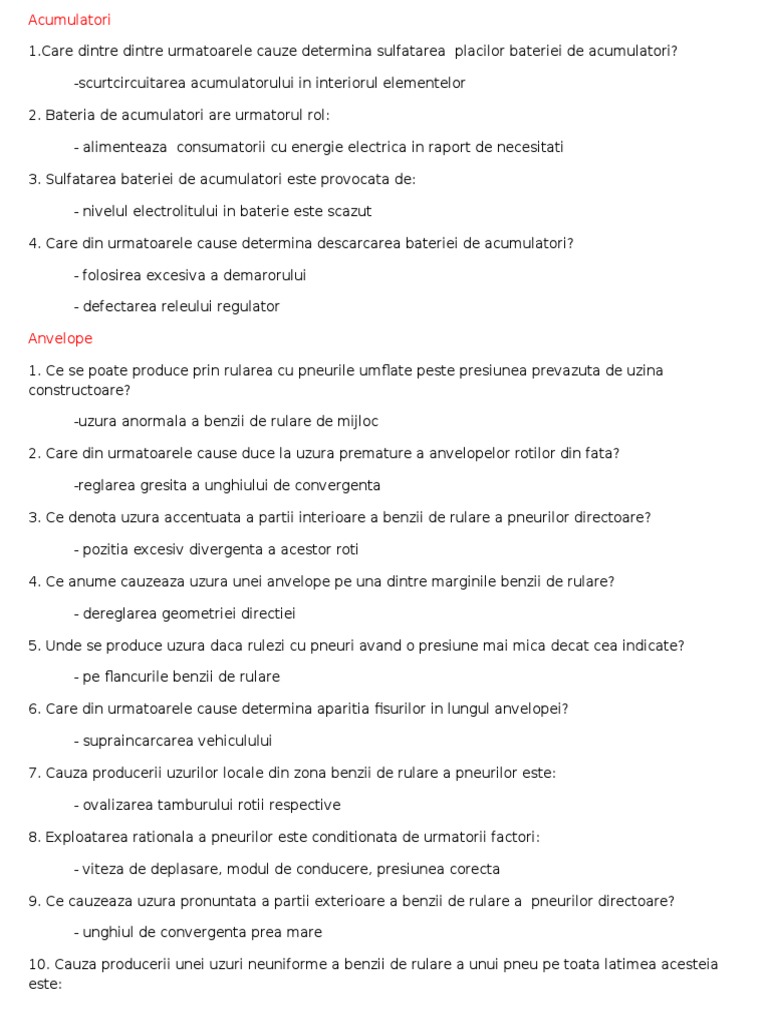 vizitati articolul complet aici : 2 Care dintre urmatoarele cauze duce la uzura prematura a anvelopelor rotilor din fata? Care din următoarele cauze duce la uzura prematură a anvelopelor roţilor din faţă: Unghiul de cadere prea mare la o roata duce la uzura uniforma a pneurilor în cazul rularii cu un pneu umflat sub presiunea indicata de constructor, uzura neuniforma a benzii de rulare se produce