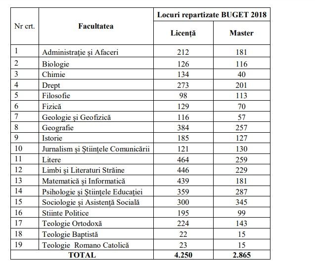 Facultatea de geografie 16,4 candidati pe loc. Universitatea din bucurești dispune, in 2018, de 4.250 locuri bugetate pentru licenta si 2.865 locuri bugetate pentru master. Conform www.adevarul.ro , cel mai puțin căutate specializări în 2018 sunt istoria, ştiinţele sociale, fizica şi teologia.