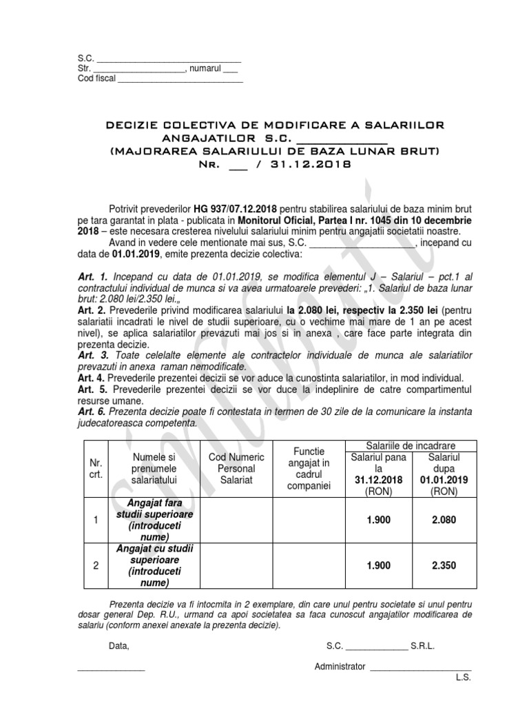 vizitati articolul complet aici : 2 Actul aditional trebuie confundat insa anexa contract. Consideri ca munca ta este mult daca raspunsul la intrebarile de mai sus este da inseamna ca a venit momentul sa ii ceri managerului tau o marire de salariu. Salariul minim pe economie a crescut de la 1 ianuarie 2018, dincolo de mutarea contribuțiilor sociale de la angajator la angajat.